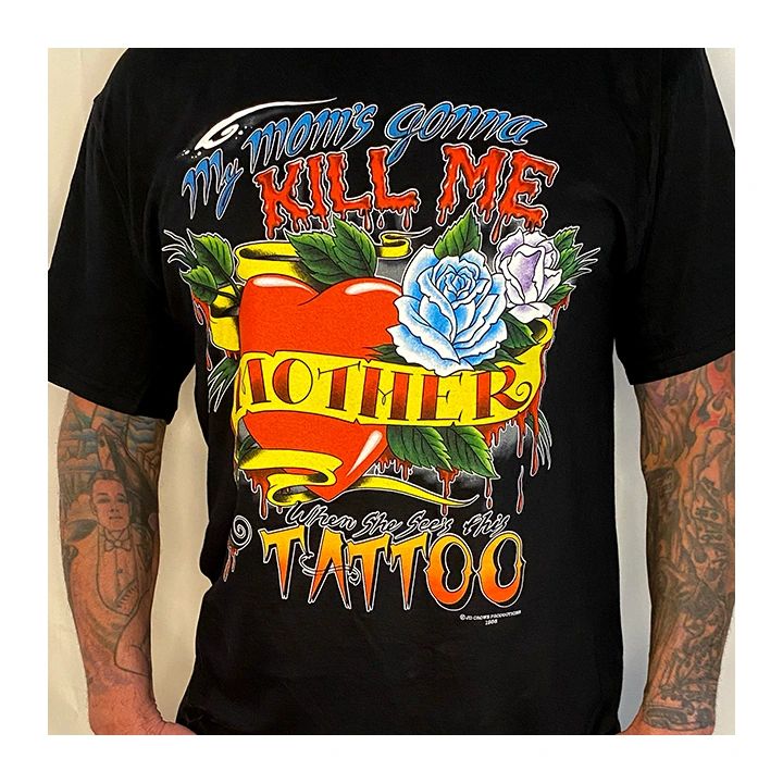 In 1988, JD Crowe introduced the world to the first commercial Tattoo Art T-shirts. The original Tattoo Art T-shirts consisted of four tattoo art designs that quickly made their way around the world. “My Mom's Gonna Kill Me” was one of the original four designs that were created.